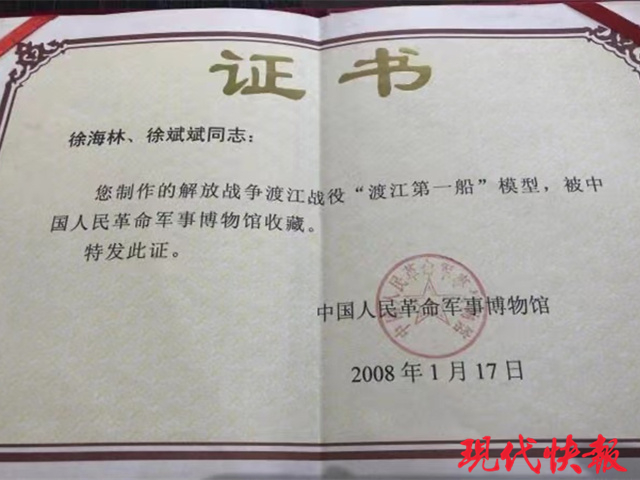 在這樣的背景下,徐海林制作了“渡江第一船”模型。最讓他得意的是,中國(guó)軍事博物館的專家們最看到“渡江第一船”船模后,給予了高度評(píng)價(jià),并征得他的同意,將該模型收藏于中國(guó)人民革命軍事博物館。