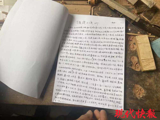 對(duì)于這些“寶貝”的創(chuàng)作背景,徐海林可謂是如數(shù)家珍,每一個(gè)都做足了功課。在徐海林的工作室中,有兩疊厚厚的紙,詳細(xì)記錄著每一艘船模背后的紅色故事,這些資料一筆一畫(huà)都是手寫(xiě),足見(jiàn)其工夫。