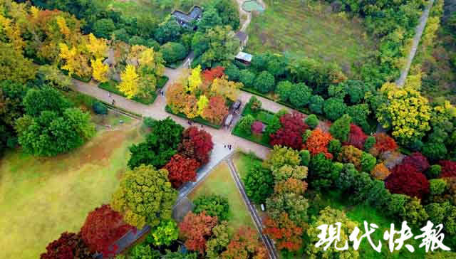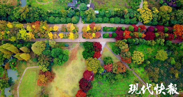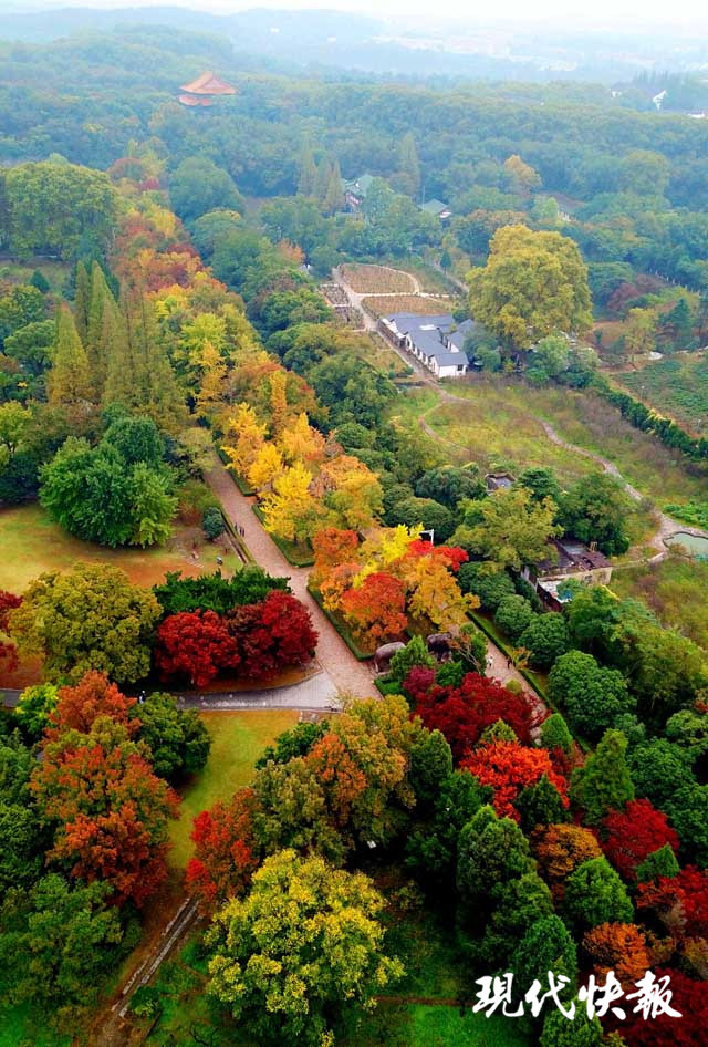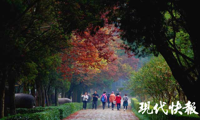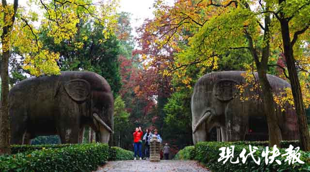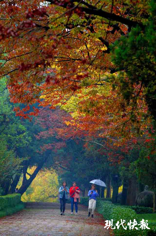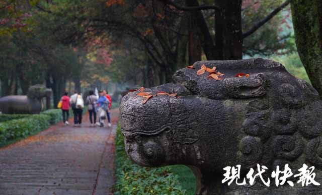 經(jīng)過秋雨的洗禮,位于明孝陵景區(qū)的石象路色彩更加濃艷,紅、黃、橙、綠數(shù)色相間,美如畫卷。秋雨打過落葉,飄落在石像之上,那是屬于金陵的古都遺韻。