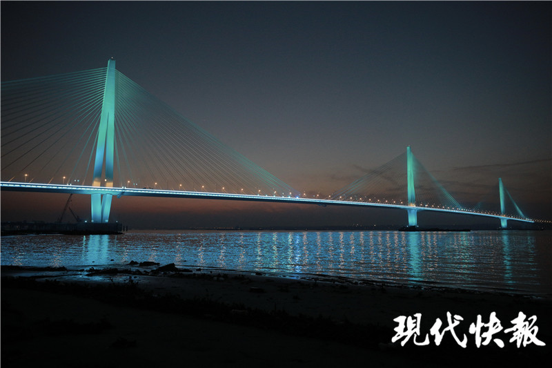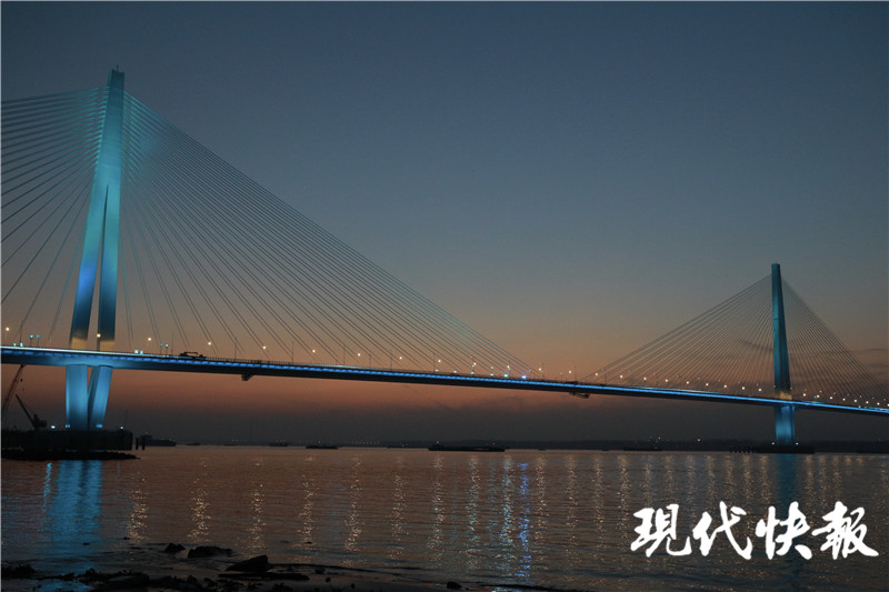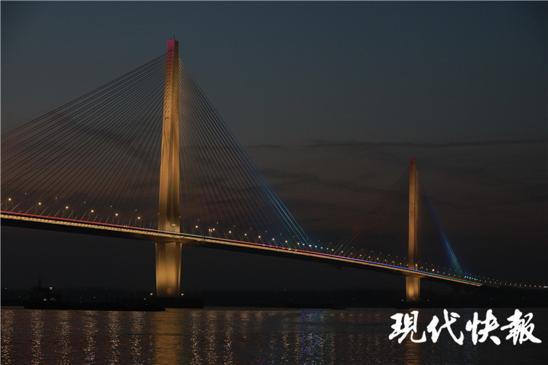 江心洲長(zhǎng)江大橋的燈光準(zhǔn)點(diǎn)亮起,進(jìn)行亮燈調(diào)試,流光溢彩的索塔與橋面交相輝映,如彩色的長(zhǎng)龍橫臥江面,與城市夜景融為一體,曼妙無(wú)比。