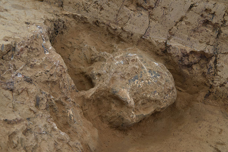 湖北十堰學(xué)堂梁子遺址發(fā)掘現(xiàn)場被命名為“鄖縣人3號頭骨”古人類頭骨化石出土情況(國家文物局供圖)。