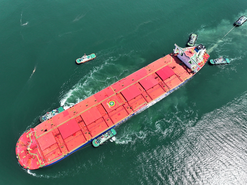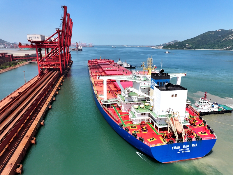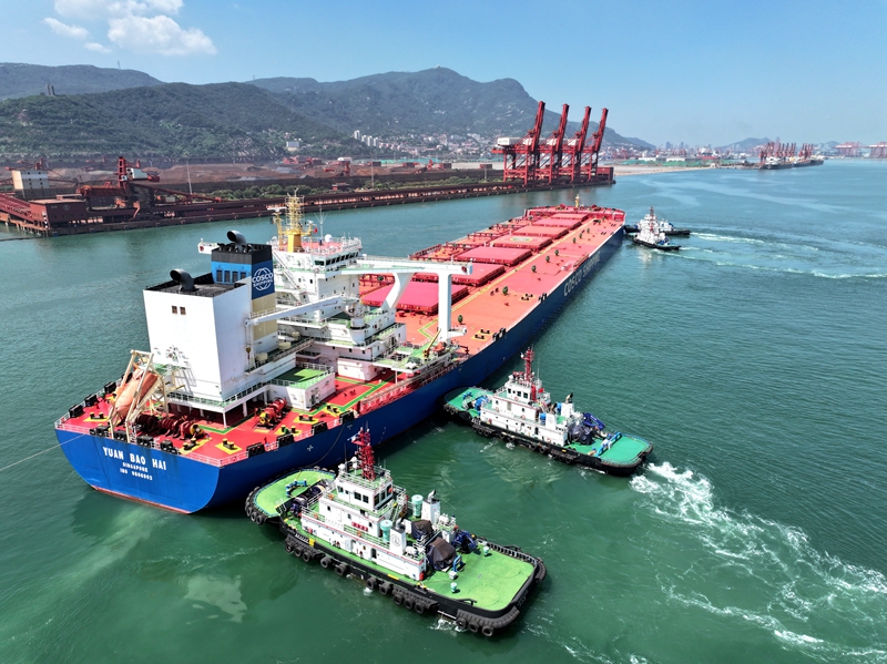 8月12日,從巴西駛來的滿載40萬噸鐵礦石的新加坡籍“遠(yuǎn)寶海”輪靠泊江蘇省連云港新蘇港碼頭。該輪長362米、寬65米,是今年以來靠泊連云港的第15艘40萬噸級(jí)貨輪。新華社發(fā)(王春?攝)