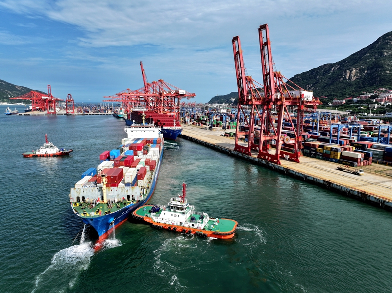 8月24日,在江蘇省連云港港集裝箱碼頭,貨輪正在裝卸集裝箱(無人機照片)。新華社發(fā)(王春 攝)
