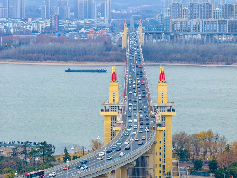 1月25日拍攝的南京長(zhǎng)江大橋上的車(chē)流(無(wú)人機(jī)照片)。新華社發(fā)(楊素平?攝)