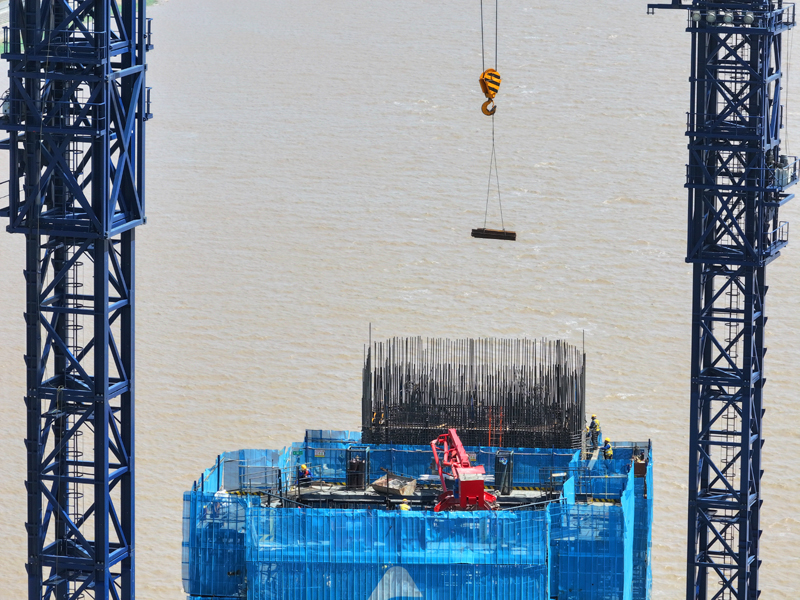 4月13日拍攝的崇啟公鐵長江大橋4號主塔(左)第17節(jié)澆筑施工現(xiàn)場(無人機照片)。新華社發(fā)(許叢軍?攝)