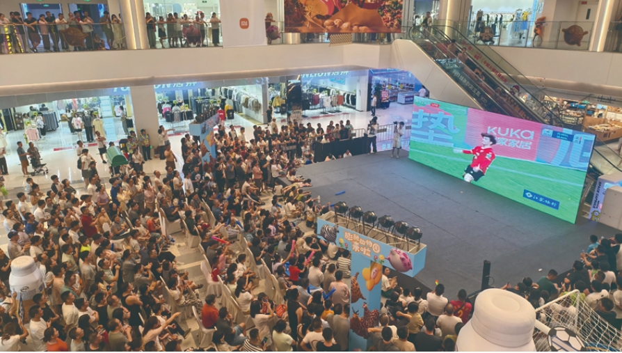 6月29日晚,昆山一家商場現(xiàn)場直播“蘇超”比賽蘇州隊對陣揚州隊的比賽。? 蔣文超 攝 視覺江蘇網(wǎng)供圖